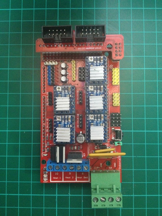 RepRap Arduino Mega Pololu Shield, or RAMPS for short. It is designed to fit the entire electronics needed for a RepRap in one small package for low cost. RAMPS interfaces an Arduino Mega with the powerful Arduino MEGA platform and has plenty room for expansion. - RepRap